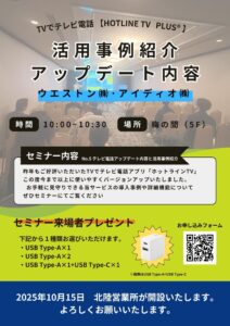 10月3日(金)名古屋市で開催されました展示会、日本ケーブルテレビ連盟東海支部主催「ケーブルフェスタ2025」に出展いたしました。ケーブルテレビ事業者さまや施工会社さまをはじめ50名を超える多くのかたにセミナーへのご参加、展示ブースへご来場いただきありがとうございました、心から感謝申し上げます。