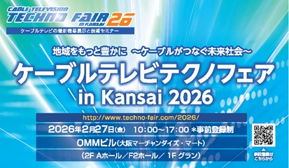 大阪市中央区で開催する展示会、日本ケーブルテレビ連盟近畿支部主催「ケーブルテクノフェア in Kansai 2026」に出展いたします。「地域をもっと豊かに ~ケーブルがつなぐ未来社会~」をテーマとして下記の通り開催されます。当日は展示と技術セミナーも実施します、お忙しいかと思いますが、みなさまのご参加お待ちしております。