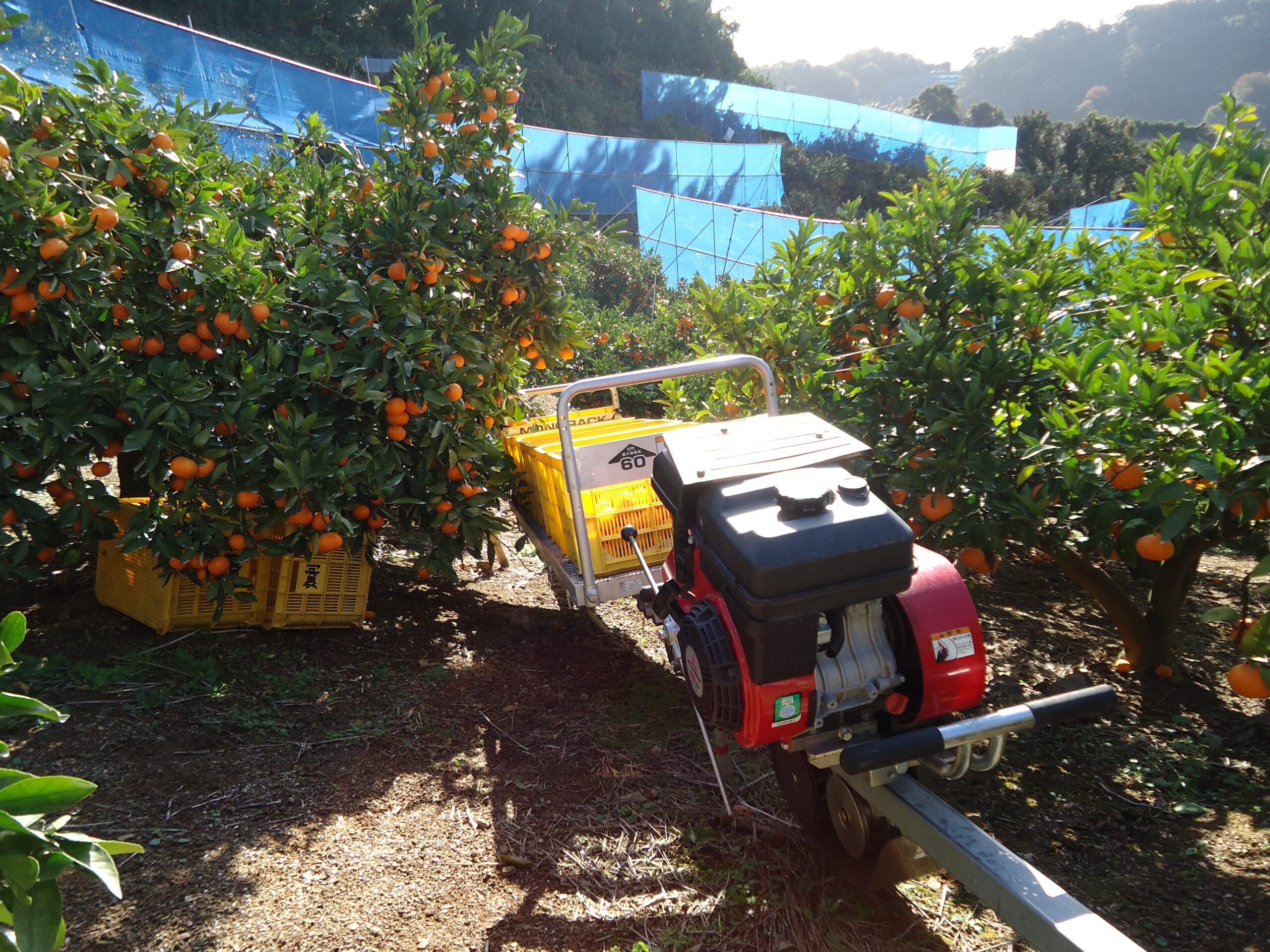 頭上に棚がある果樹園での運搬に、低い姿勢で走る「低床モデル」を導入。人の背丈以下の空間でも効率よく荷物を運び出します。