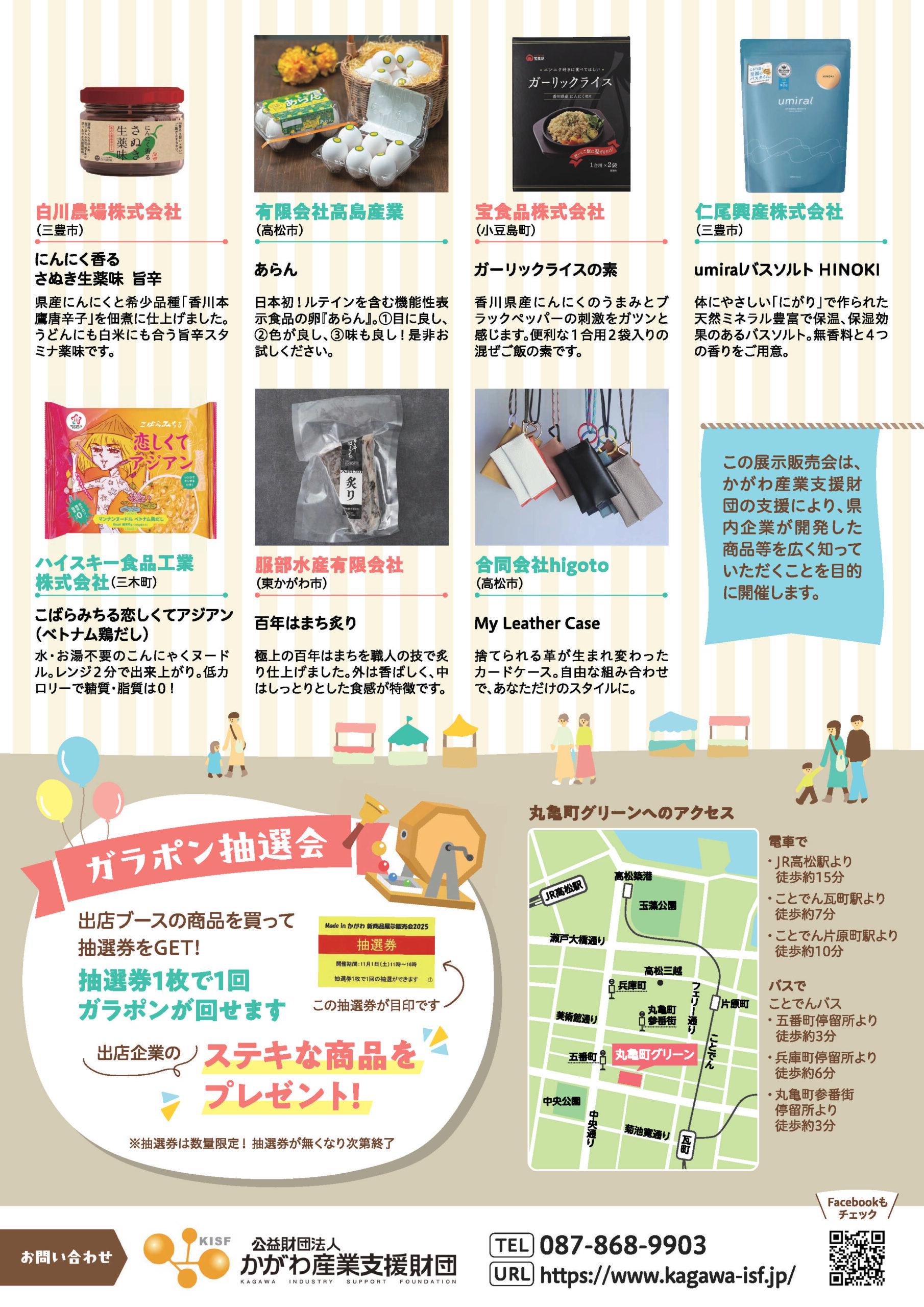 香川県・公益財団法人かがわ産業支援財団が主催で、新ファンド等事業による助成金を活用して開発又は販路開拓した新商品を広く知っていただくことを目的に、丸亀町グリーンにて展示販売会を開催します。地元企業の素晴らしい商品や技術を身近に感じることができる貴重な機会となっています。ぜひお越しください。
